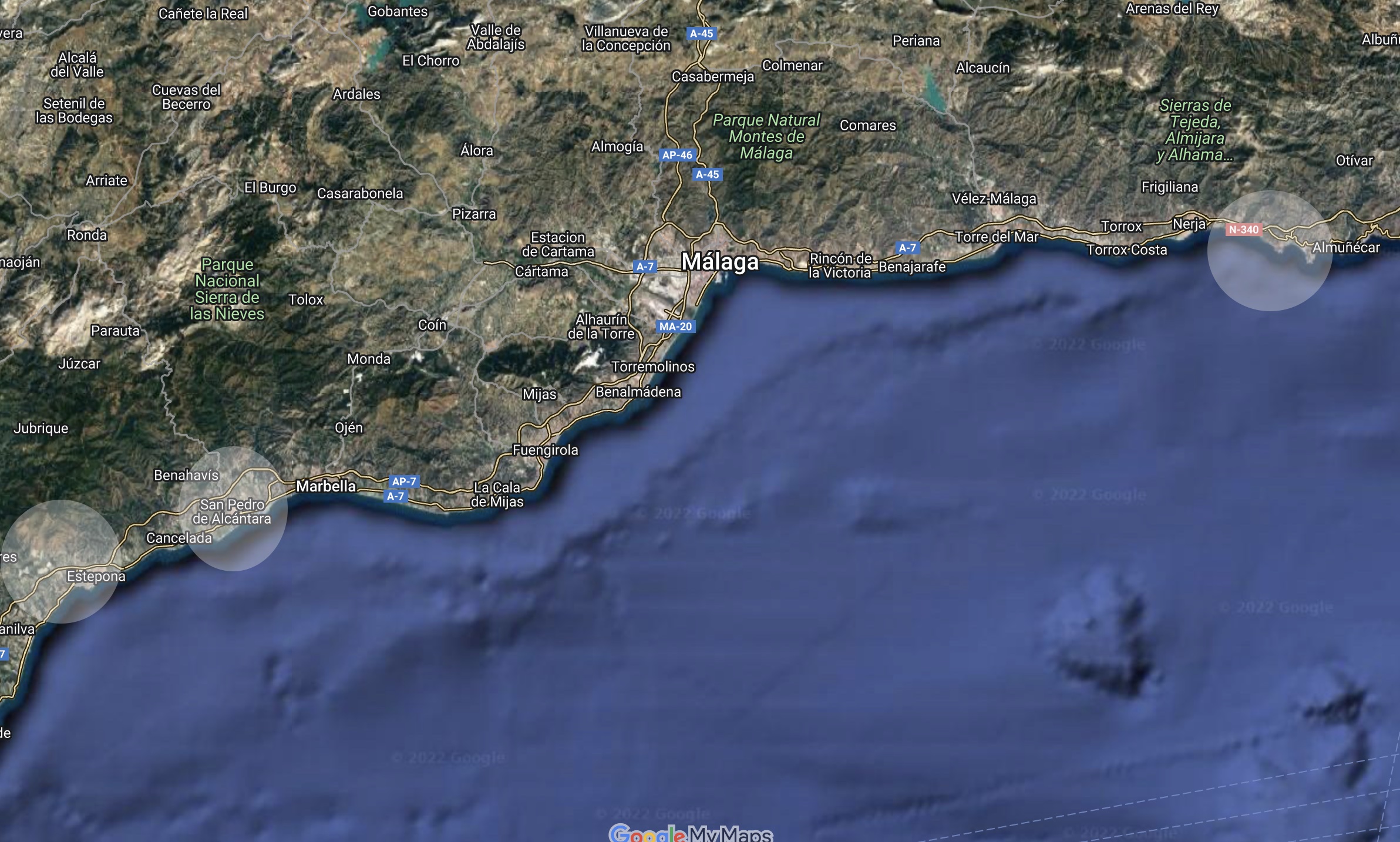 The search area between Estepona & Nueva Andalucía plus La Herradura to the east of Málaga
